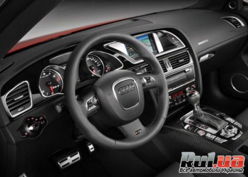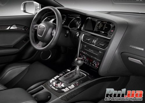 В интерьере салона Audi RS5 Coupe 2011 также прослеживается элегантный динамический стиль. В стандартной комплектации устанавливаются спортивные сидения с интегрированными подголовниками и выраженной боковой поддержкой с Алькантарой и кожей. Руль покрыт перфорированной кожей и имеет существенные обода. Черный интерьер с алюминиевыми накладками, карбоновой отделкой, украшенный логотипами RS5 представляет собой воплощение динамики и элегантности.