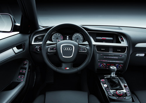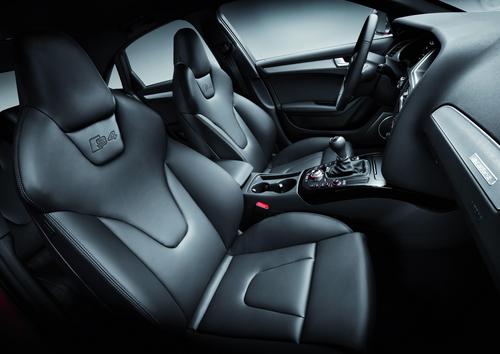 Спортивные сиденья оборудованы поясничным подпором с электрическими регулировками и выдвижными опорами для ног. Панель приборов выдержана в серой гамме, гармонирующей с белым цветом указателей, снабженных эмблемой S4. Тот же логотип на рулевом колесе и на ключе зажигания. Интерьер, Ауди S4 Авант, выполнен в темных тонах с использованием алюминиевых вставок.